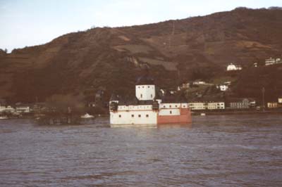 | Útközben a Rajna partján. A vízzel elárasztott kis szigeten álló ház magasodik csak ki a Rajnából a Loreley-szikla közelében. |
